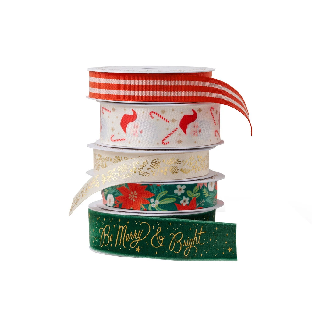 The prettiest presents, tied with a bow. Rifle Paper’s new ribbon set is designed to pair with their illustrated wrap or your favorite solid colors. The boxed set of five illustrated ribbons includes two spools of grosgrain, two spools of satin, and one spool of velvet ribbon with metallic gold accents.