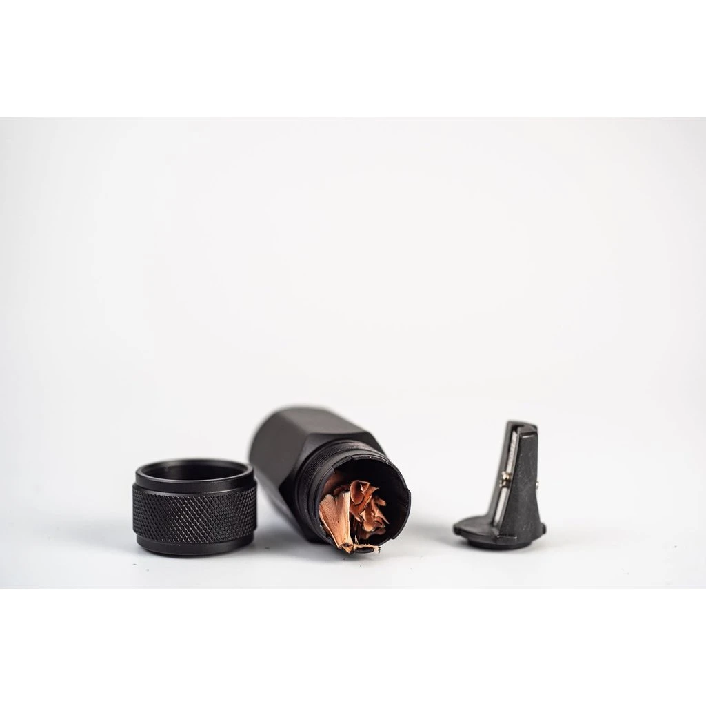 The body is made of durable machined aluminum and the sharpening unit features a German steel blade. The canister can hold three fresh sharpens before needing to be emptied.