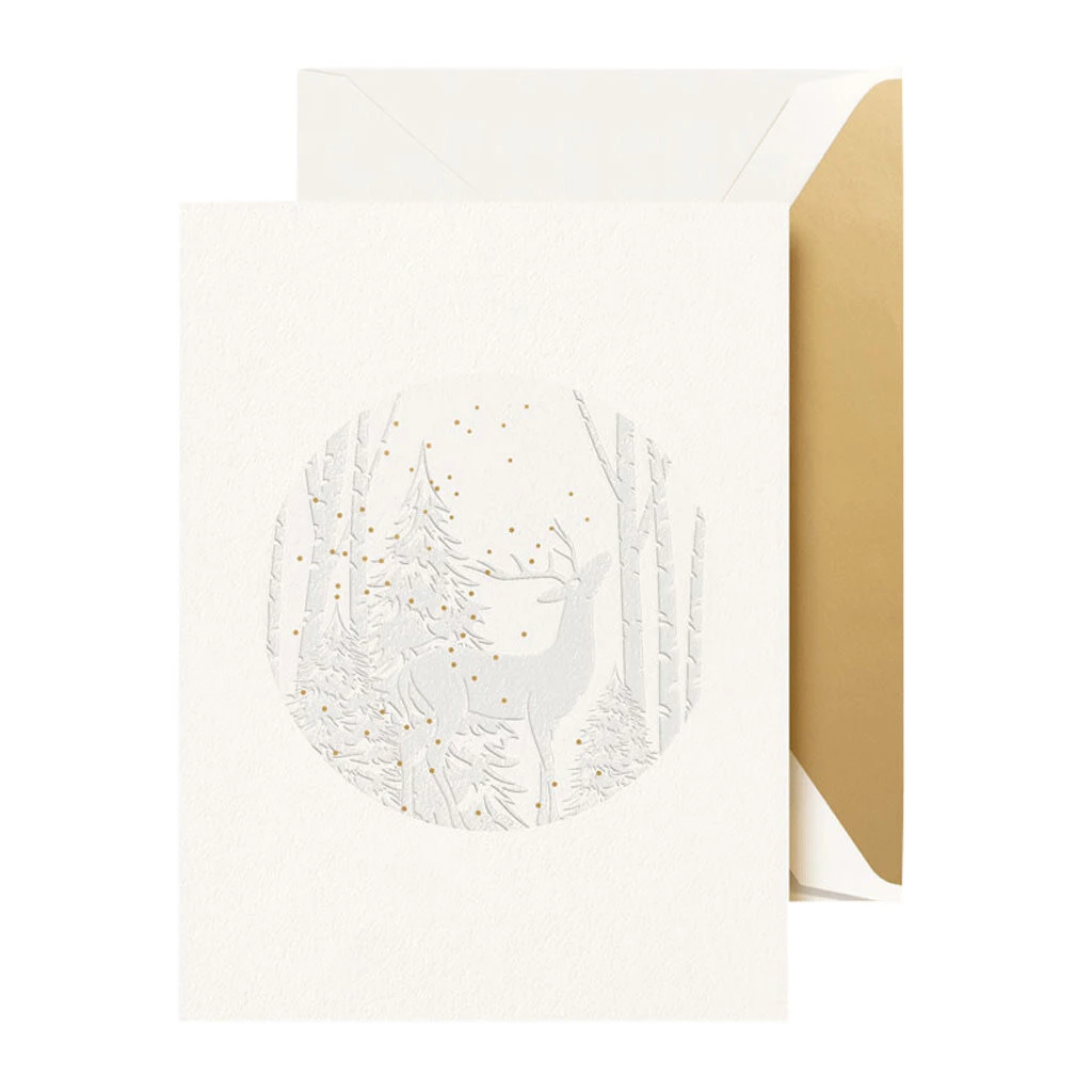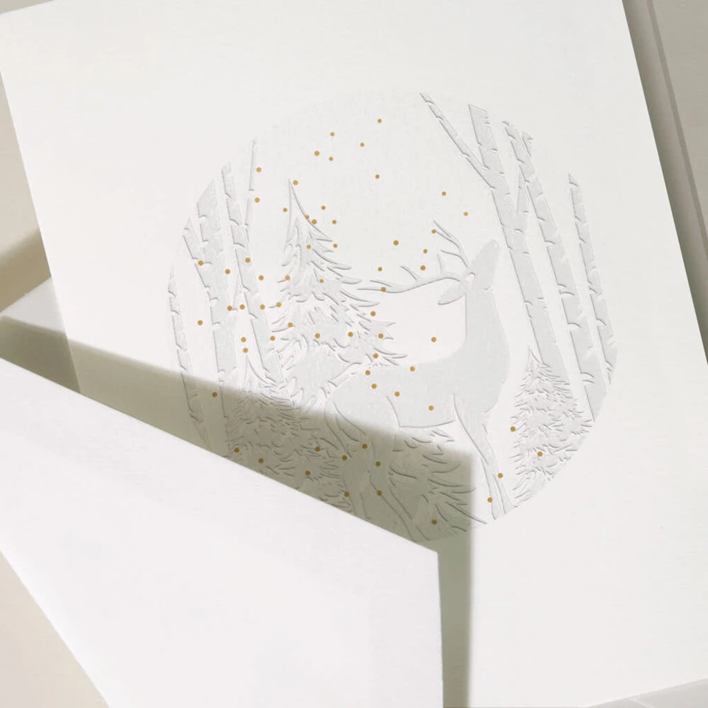Get lost in the holidays with this classic greeting card, featuring a striking forest scene with an elegant reindeer front and center. This greeting will prove a reminder to your loved ones of the season’s unwavering beauty. Deeply embossed within a forest of birch, the noble stag is known for delivering the most special of gifts — this Christmas card included.