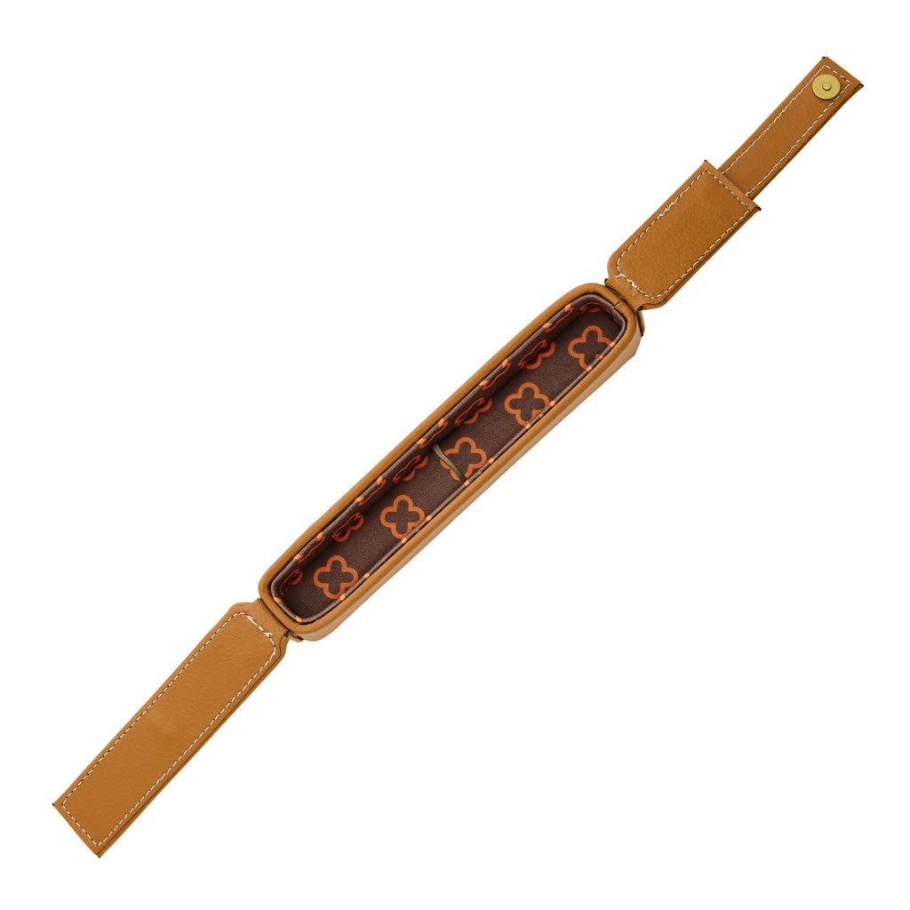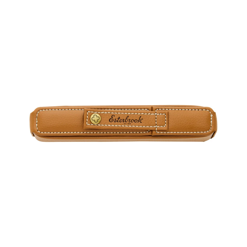 Meet the next in the series of Esterbrook Nooks. For this edition, Esterbrook has gone across the pond and chosen a beautiful British Tan to house your favorites and everyday carries. The look is classic car interior and makes a perfect companion for the office, road trip, or pen show. Consider it a boot for your pens! They’ve paired grained British Tan leatherette with contrast white stitching, gold hardware, the logo Esterbrook Eternity snap and lined the interior with the Esterbrook Eternity symbol in brown and orange. Each Nook has a flap that easily snaps and unsnaps to reveal your collection, which is housed in individual, cushioned sections, and secured with elastic for safekeeping.Â
