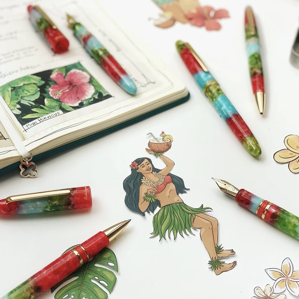 The Maui Estie will be a Limited Edition line from Esterbrook, available in regular and oversized. This Estie is fitted with gold trim and will come in standard #6 Jowo sizes (EF to Stub), including nibs from our custom nib program. It is also available in rollerball and ballpoint. Â