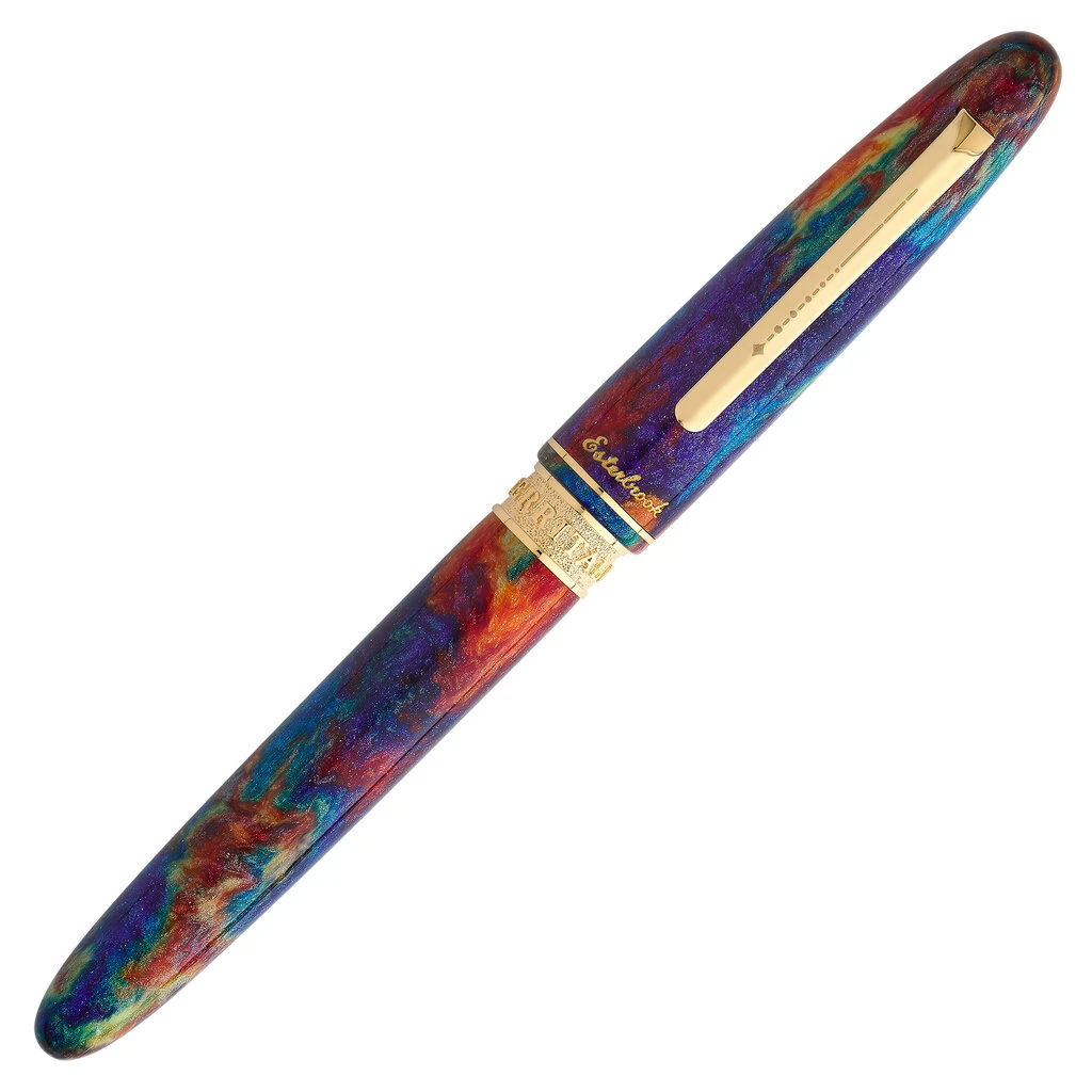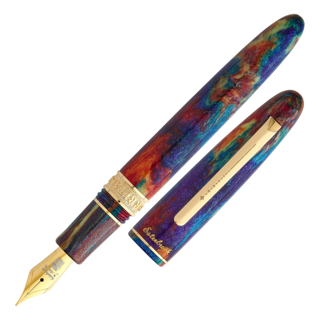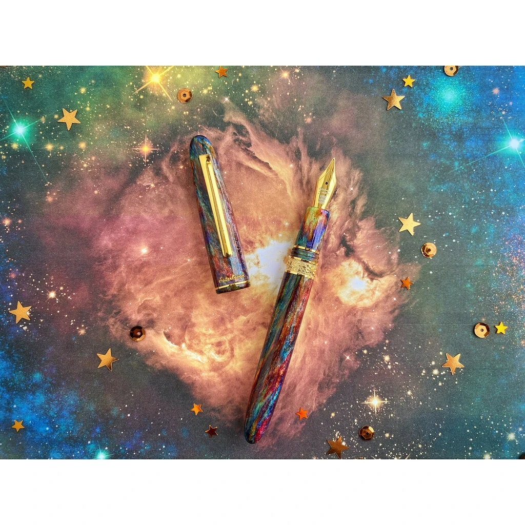 Every aspect of this pen and corresponding ink was a deliberate creative decision between Esterbrook and Ferris Wheel Press: The six-color DiamondCast material is reminiscent of the swirling clouds of gas and dust that make up nebulae. The wax casted ring adds a touch of elegance, while the gold-plated clip with star engravings provides a subtle nod to the pen’s name. The ink is a beautiful interpretation of the pen. The custom blended FWP ink is a deep, rich blue that is perfect for writing letters, journaling, or taking notes.Â