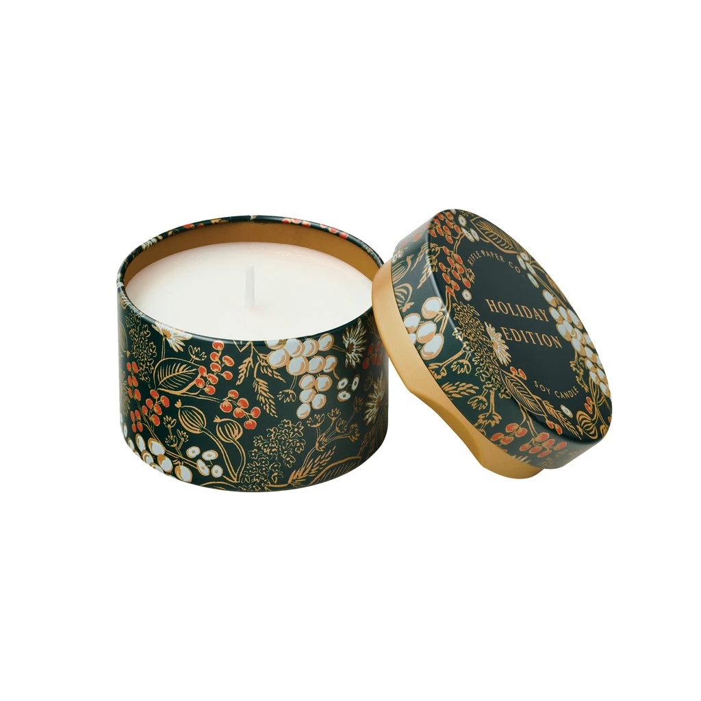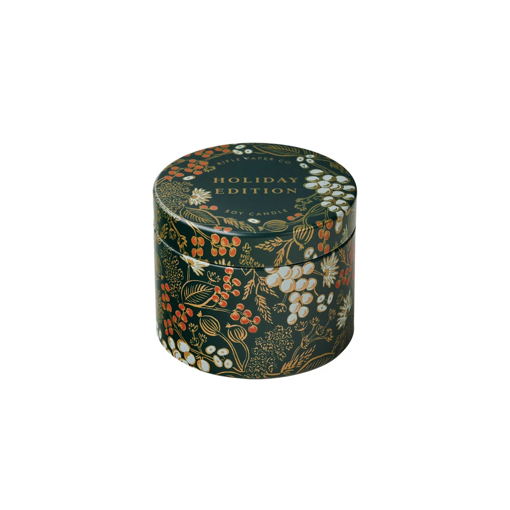 Rifle Paper’s holiday candle brings to mind memories of cozy nights by the fire, fresh balsam fir trimmings, and boughs of cranberries dipped in frost. The 3oz soy wax candle comes in an illustrated tin vessel with a matching lid.