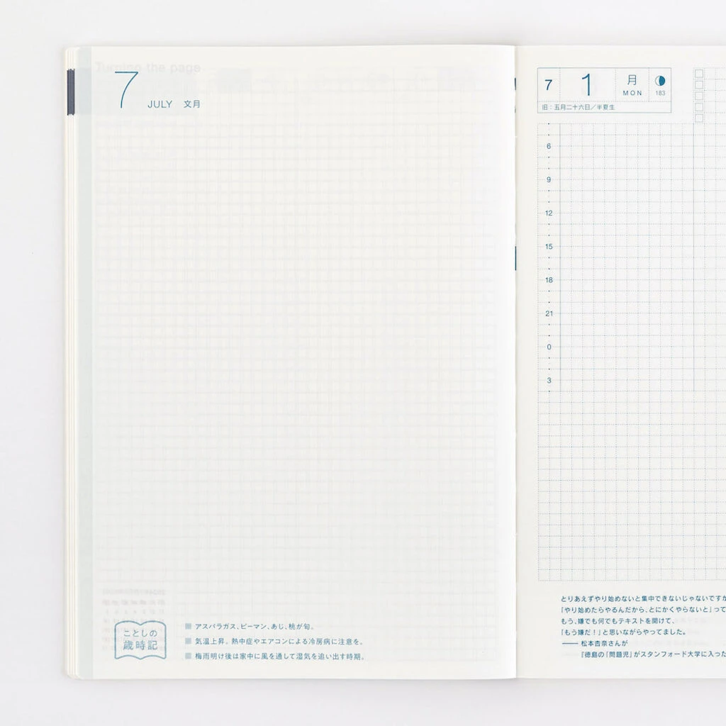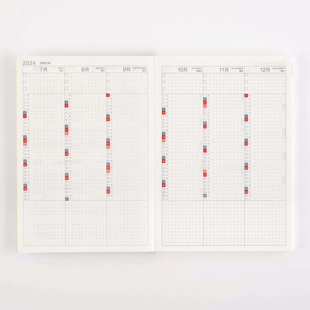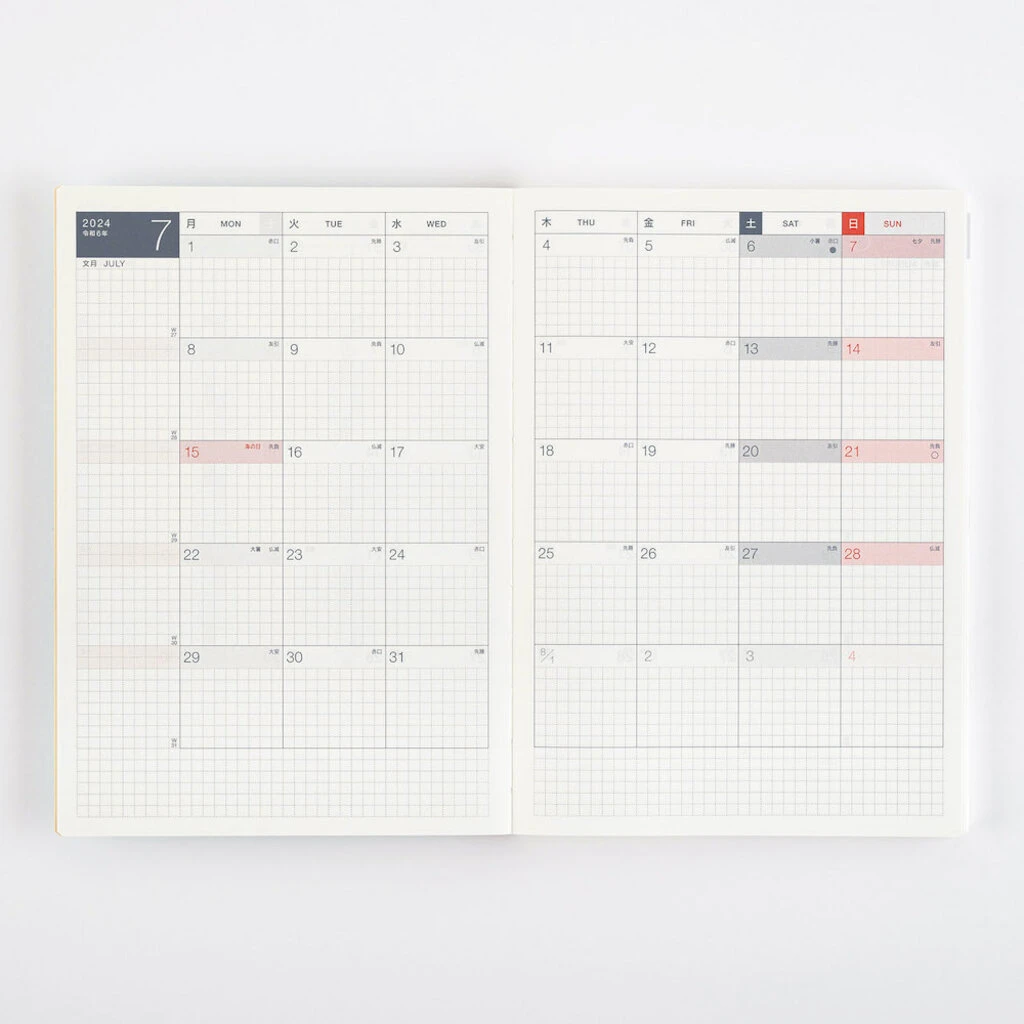 The Avec version splits the Japanese A5 Hobonichi Techo Cousin, design and all, into a 2-book set at six months each with only slight variances in calendar spans and the number of extra pages in the back. This allows you to fill the pages to your heart’s content with scheduling, diaries, little notes, tickets, photographs, doodles, and anything that strikes your fancy.