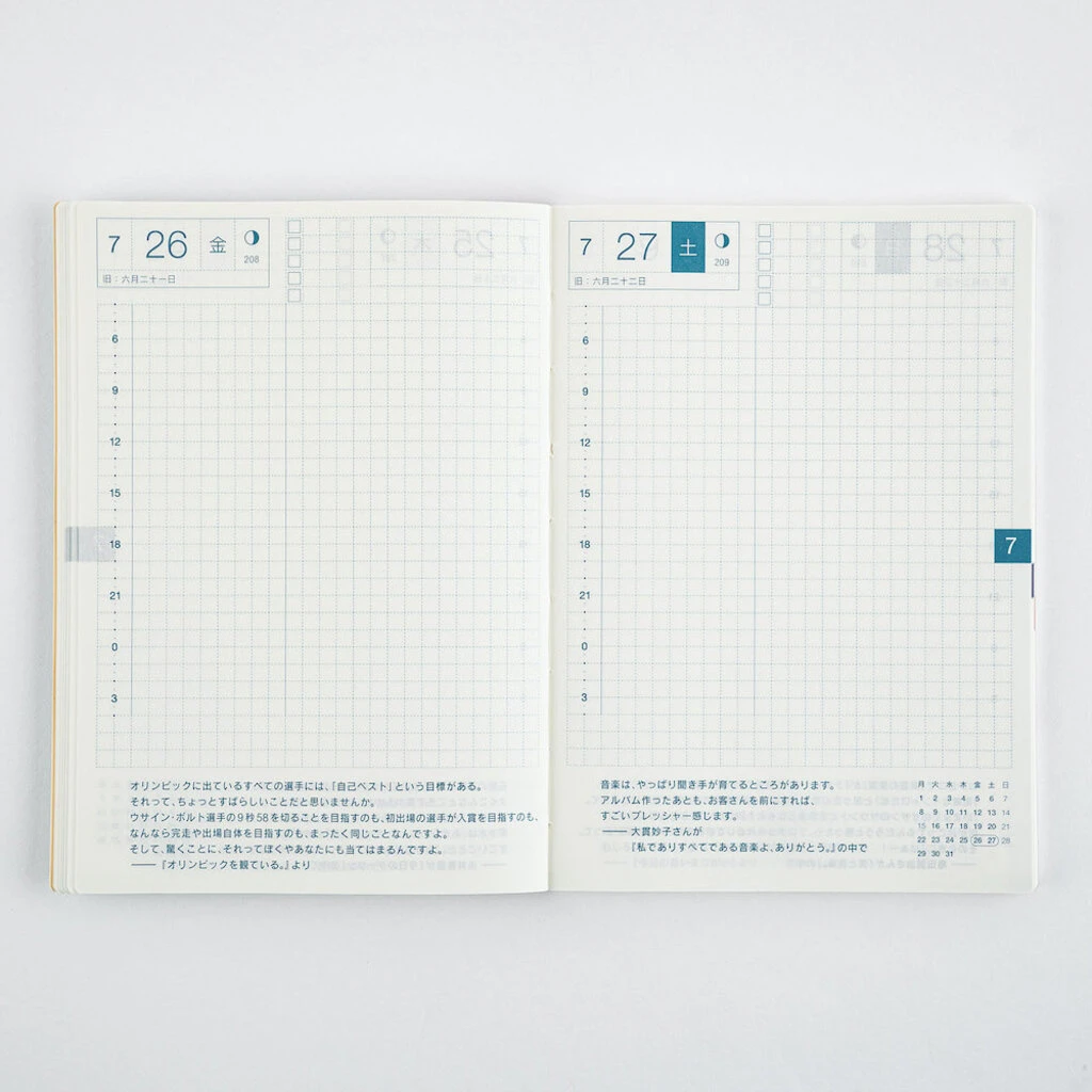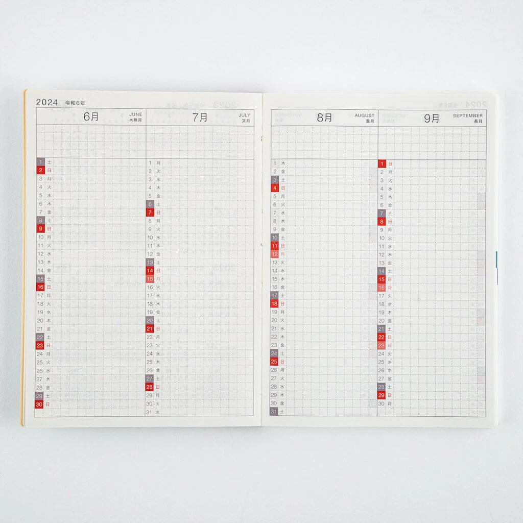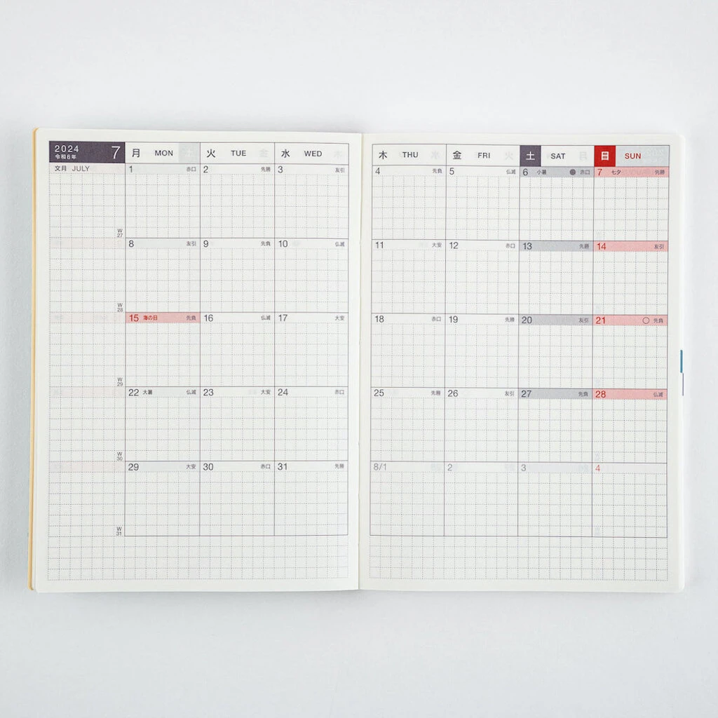 The Avec version splits the A6 Hobonichi Techo Original, design and all, into books of six months each with only slight variances in calendar spans and the number of extra pages in the back. This allows you to fill the pages to your heart’s content with scheduling, diaries, little notes, tickets, photographs, doodles, and anything that strikes your fancy.