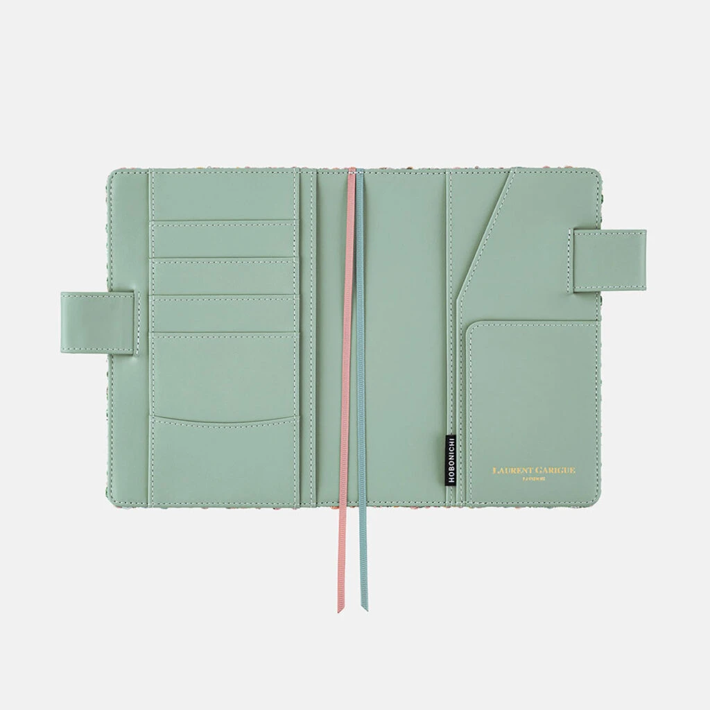 The inner cover and the “butterfly-stopper” pen holders are made of leather for long-lasting use. The smoky green leather will soothe your mind whenever you open your techo.