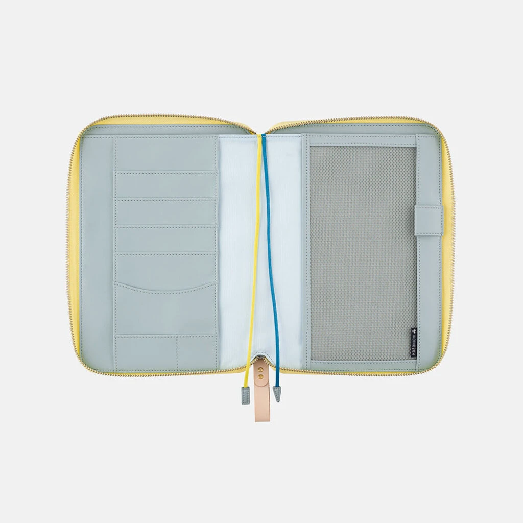 The cover interior is light blue with a fresh feel and includes vibrant yellow and blue bookmarks. The zipper pull is made from natural leather and includes a cute butterfly charm as an accent.