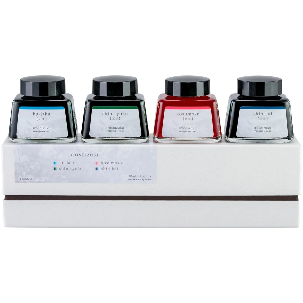These limited edition Pilot Iroshizuku sets include 4 different, 30 ml glass Iroshizuku ink bottles in a gift box.
