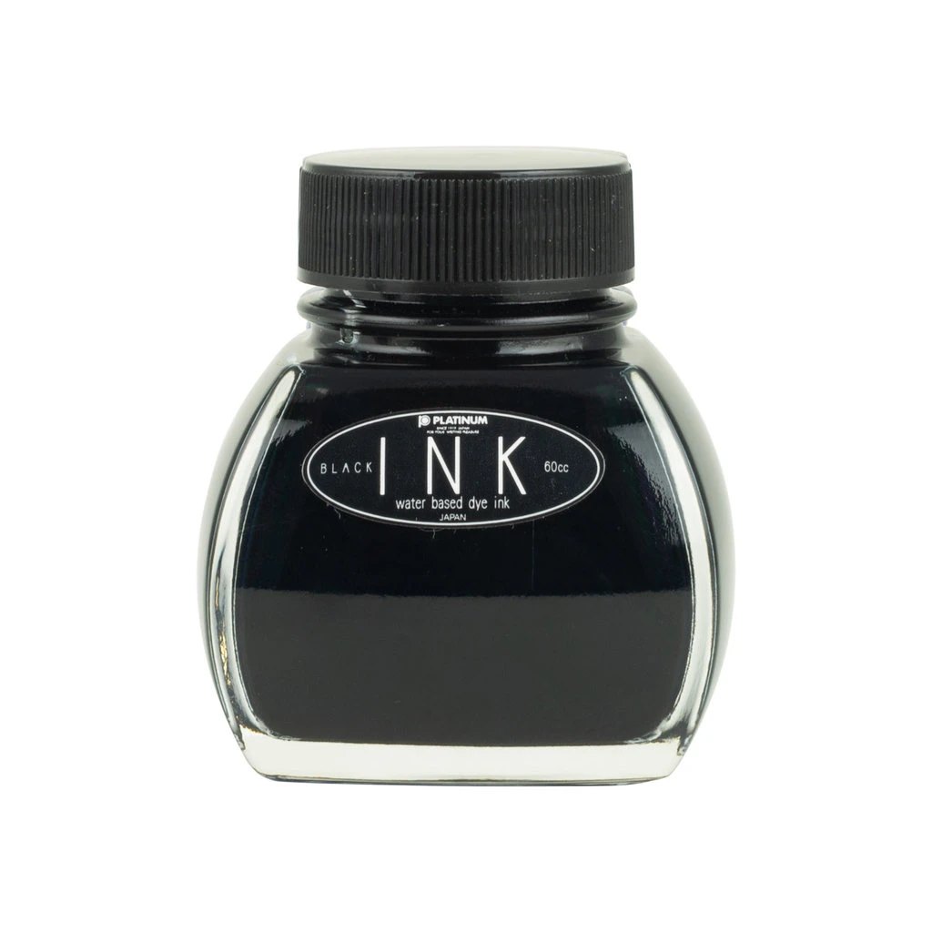 60ml bottle of Platinum Black fountain pen ink, with a built-in reservoir for easy filling.