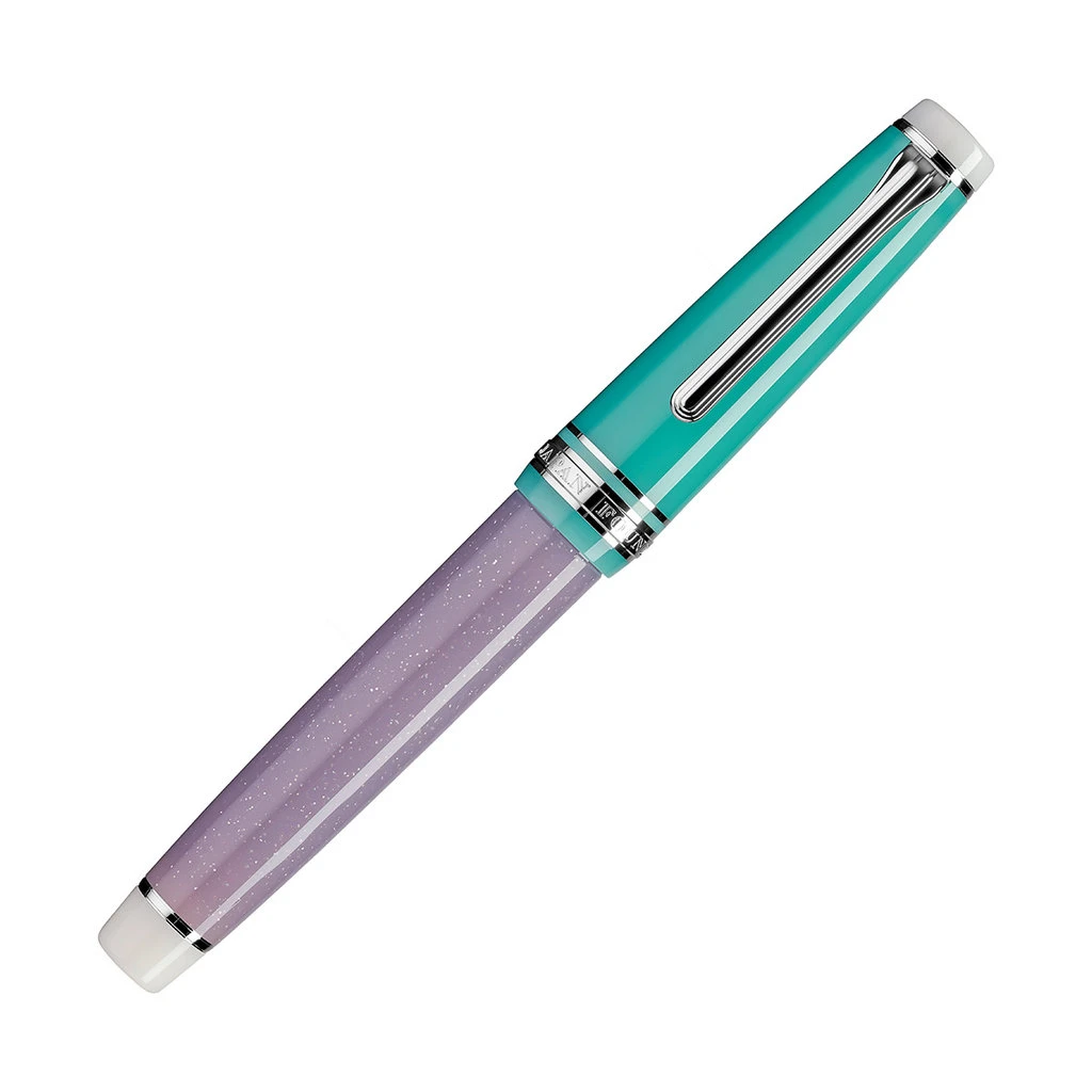Join Sailor on an exciting quest to uncover the hidden secrets of the sirens with this North American exclusive. Professional Gear Follow the Mermaid shows off a mystical combination of color with a sparkling lilac body, an icy Pacific blue-green cap and section, and white finials. The silver clip, accents, and the bi-color gold nib bring it all together with a glimmer like scales flashing in the sunlight. Embark on an adventure today, with your very own Professional Gear Follow the Mermaid by Sailor to discover what treasures it contains.