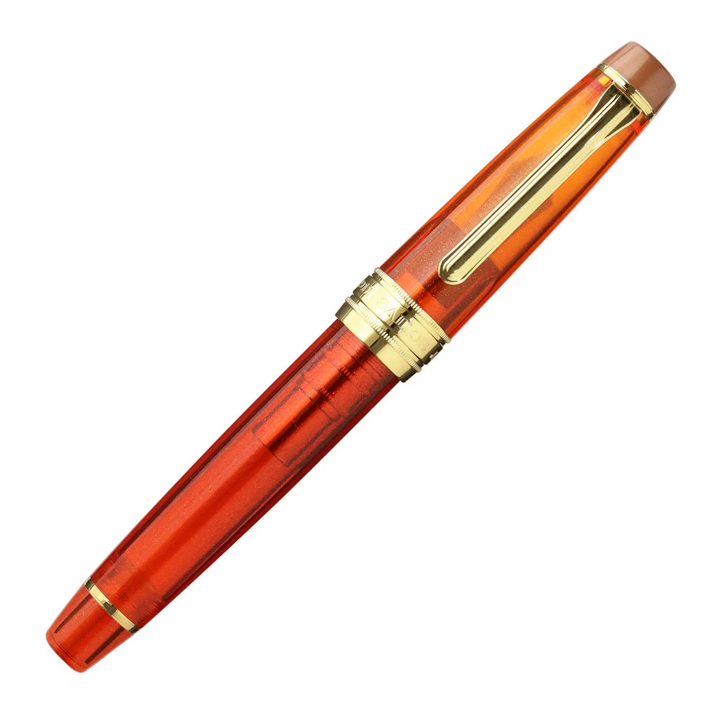 Christmas Spice Tea radiates warmth with a rich glowing amber, reminiscent of the color of spiced holiday teas with a nutmeg brown finial color and twinkling gold accents, clip, and nib.