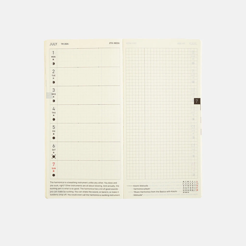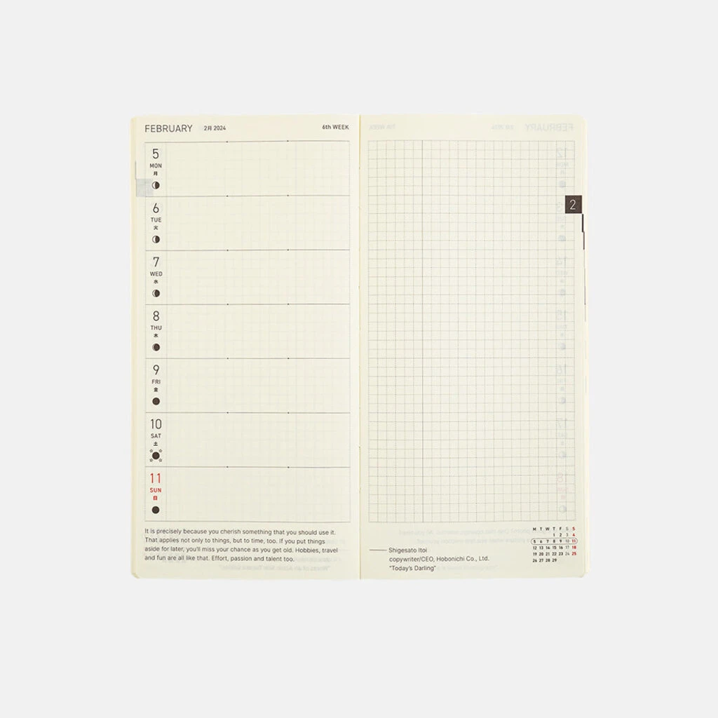 The Hobonichi Techo Weeks Mega contains approximately three times the number of memo pages as the standard Weeks. This allows users to fill the blank pages to their hearts’ content without having to worry about running out of pages, making it ideal for carrying around everywhere you go to fill with things you want to remember or sudden ideas that spring to mind.