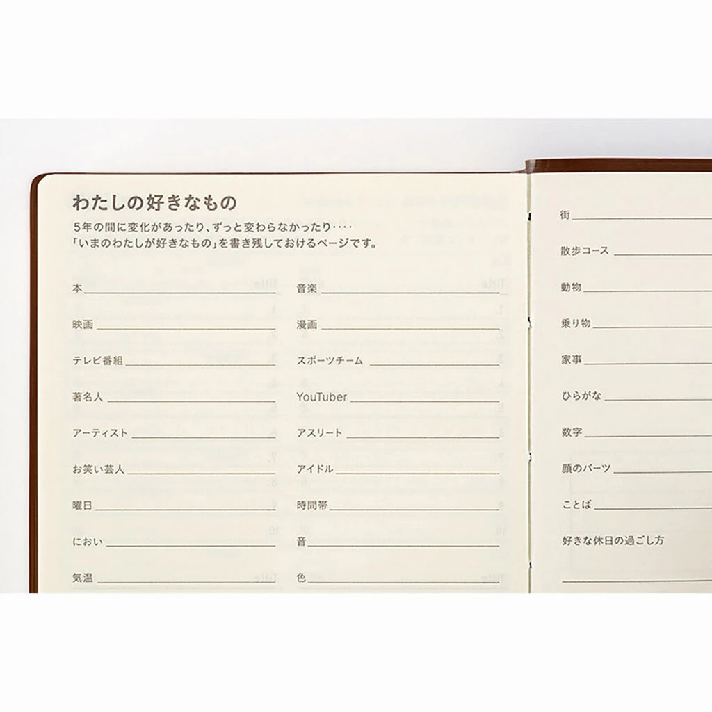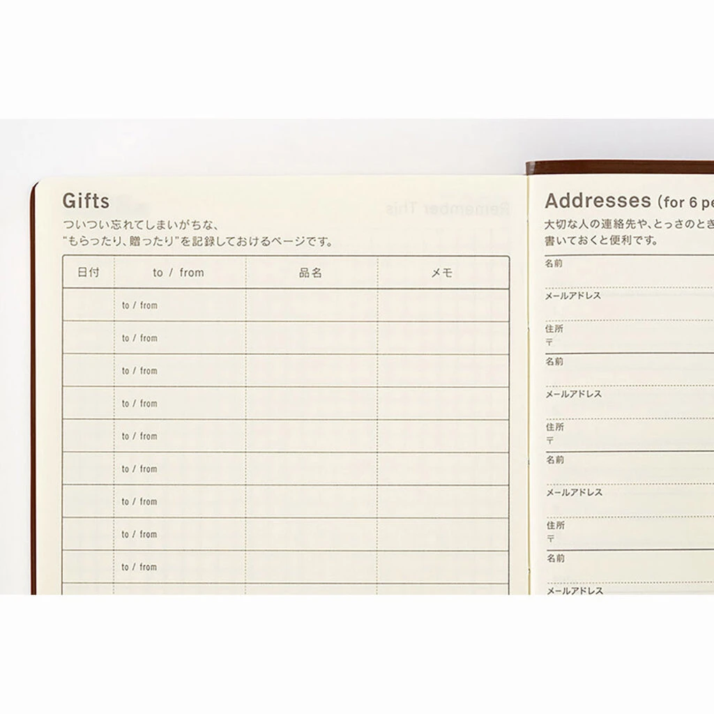 The start of the book contains a yearly calendar across the 5-year span. The back of the book contains useful pages such as “A Year Per Page” memo pages, “Gifts” for tracking gifts given and received, “Addresses” to list important contact information, “My Lists” for making a list of any theme of your choice, “My Favorite Things” to write down your favorite things by answering questions, and “Personal Notes” to record information about yourself. (These pages are in Japanese.)