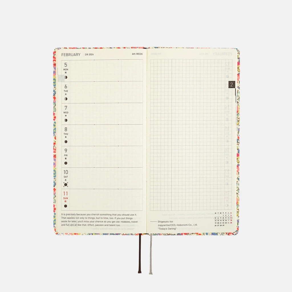 Foil-pressed in gold is the year 2024 on the front cover and spine, and the name Hobonichi on the back.