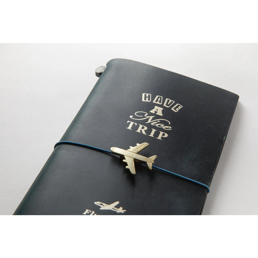 Brass Charm Airplane can be attached and glide along the elastic of TRAVELER’S notebook.