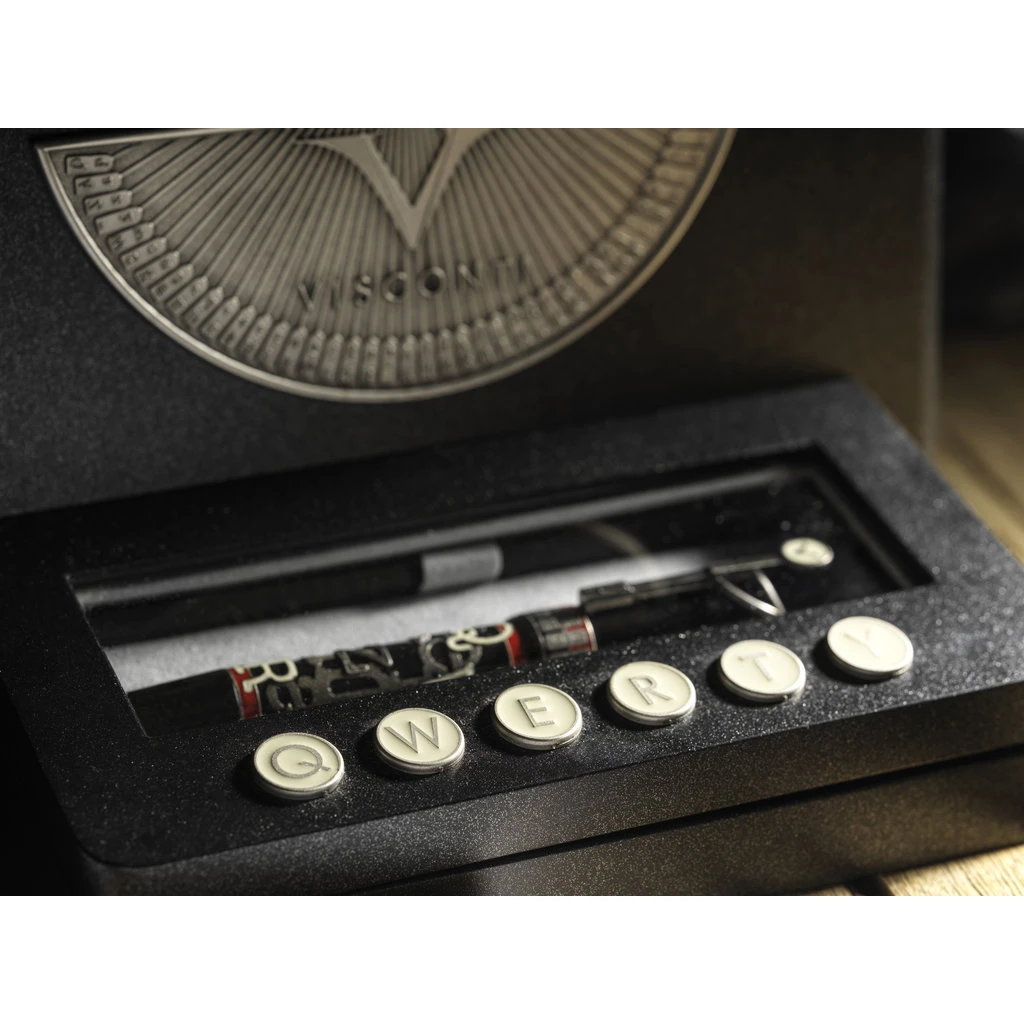 Visconti was inspired by the first Remington typewriters when crafting the limited edition Qwerty box. The upper part, complete with a hinged opening in aged-silver, contains a red and black glass ink bottle. The lower section, where the writing instrument is stored, has a magnetic closure system and a glass window that allows a glimpse of the pen. The lid is embellished with aged-silver and ivory enameled keys that make up the word Qwerty. The case also showcases an aged-silver plaque with the Visconti logo, reminiscent of typewriter strikers.